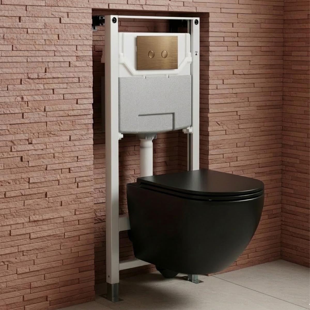 Bringing together bold colour and concealed functionality, this toilet set is designed to give modern bathrooms a clean, built-in finish. It includes a matt black soft-close seat, a pre-wall 1.2m W.C. frame with a concealed cistern, and a brushed bronze flush plate for a warm metallic accent.